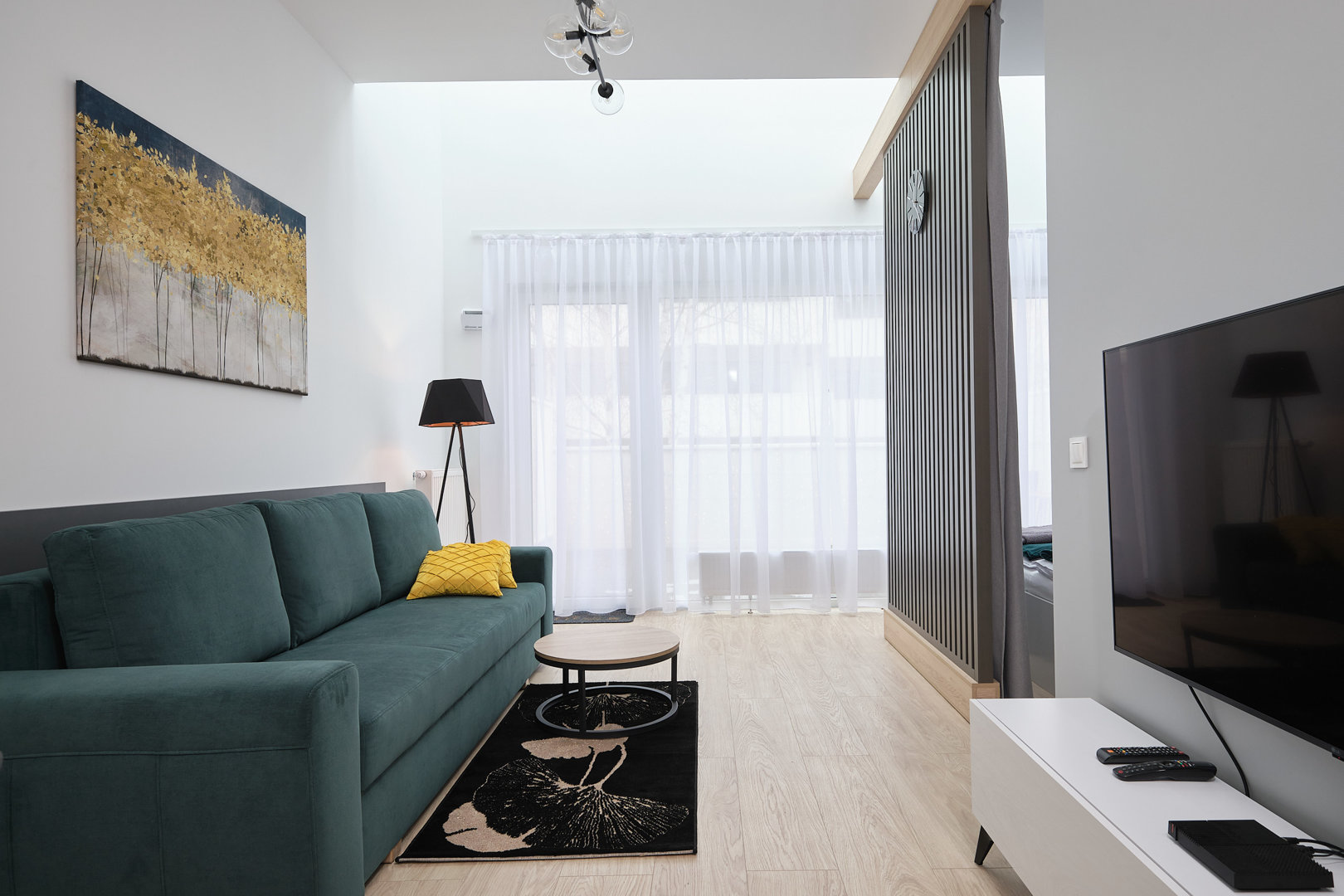 Do dyspozycji jest nowoczesna, w pełni wyposażona kuchnia z granitowym blatem, zmywarką, płytą indukcyjną i nowoczesnym ekspresem do kawy. W Apartamencie zapewniono 1 sypialnię z małżeńskim łóżkiem, rozkładaną sofę w salonie, smart TV 4K z telewizją kablową, wi-fi, łazienkę z prysznicem.